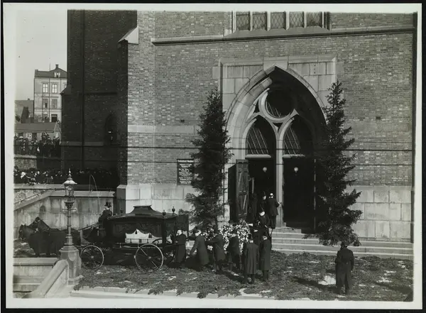 Bjørnstjerne Bjørnsons gravferd, Trefoldighetskirken, hester, vogn, mennesker, kiste, grantrær, granbar