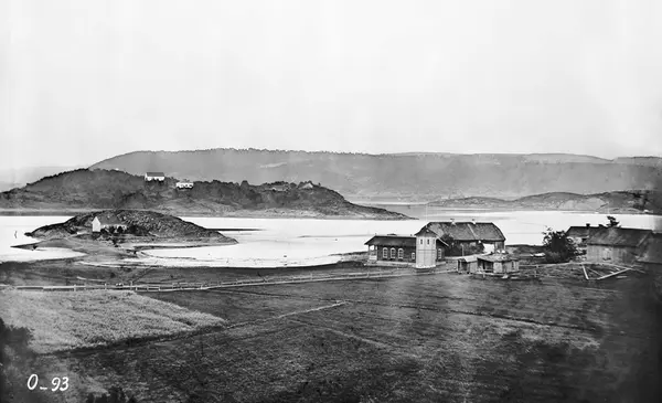 Huset med tårn er det nye skytterhuset fra 1863. Huset bak det er "Stamhuset", huset til høyre for det er "Vinterhuset". "Løa" helt til høyre i bildet. Huset mellom løa og nye skytterhuset er klubben Skarpskyttens første klubbhus "Skytepaviljongen" fra 1849. Der står idag et nyere hus med navnet "Seterhytten".