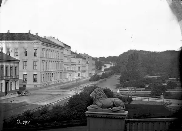 utsikt, løveskulptur, gateløp, bygårder, apotek, hestekjøretøy, mennesker, park