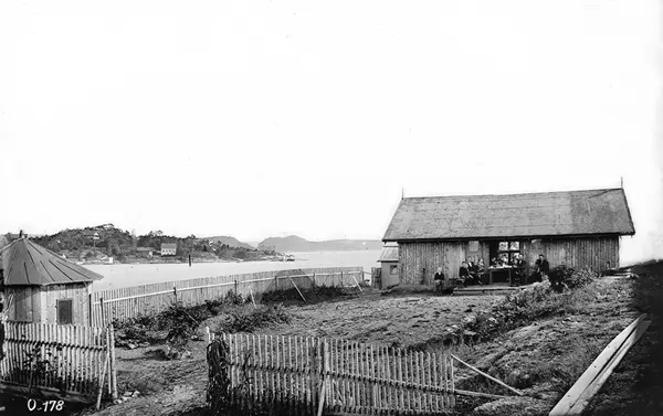 Byfogd og forfatter Oluf Vilhelm Falck-Ytters hus "Skjæret" på Bleikøykalven. Han sitter til høyre i døråpningen med datteren på fanget. Sjursøya i bakgrunnen til venstre.