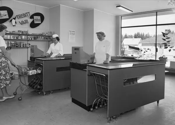 Strømmen samvirkelag avdeling 7, interiør, kasser, kassadamer, kunde, trillevogner
