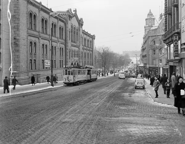 gateløp, gateliv, biler, mennesker, Sinsen-trikk, tafikklys, gatebelysning, Stortingsbygningen, forretningsgårder, snø