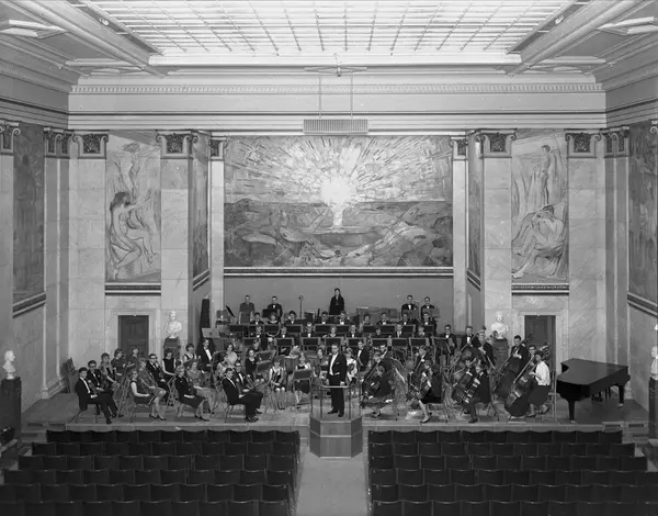 Universitetet, interiør, aulaen, NRKs juniororkester, dirigent, benkerader, veggmalerier