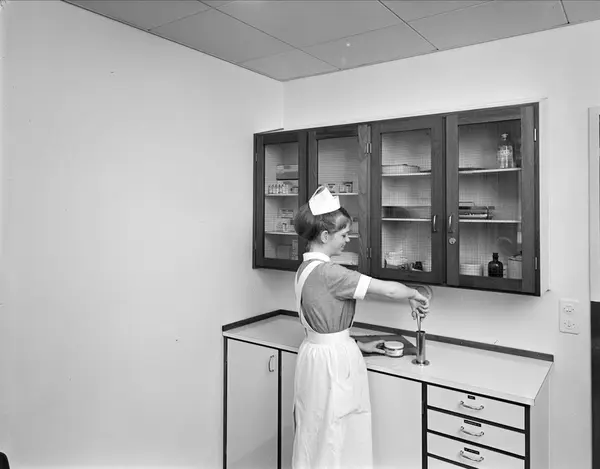 Sannynligvis en sykepleier-elev, fordi hun har korte ermer på sin uniform. Instrumentet hun holder er sannsynligvis en tang/låsbar pinsett, - og den er steril. Den ble satt opp i en metallkolbe som også var steril når hun f.eks. hadde brukt den til å hente ut sterile tupfere eller annet utstyr som skulle være sterile. Dette var før engangsutstyret kom. Hun arbeider forøvrig på ren benk. Det var klare regler om rene og urene sider/benker slik at man kunne arbeide effektivt, et slikt rom kunne være på den rene siden av et urent rom som f. eks. et skyllerom. Der var det strenge regler om rene og urene flater. Arbeidsmetode var oftest fra venstre mot høyre.