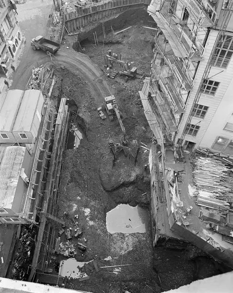 byggetomt, Grand Hotels tilbygg, mennesker, lastebiler, anleggsmaskiner, Grand Hotel
