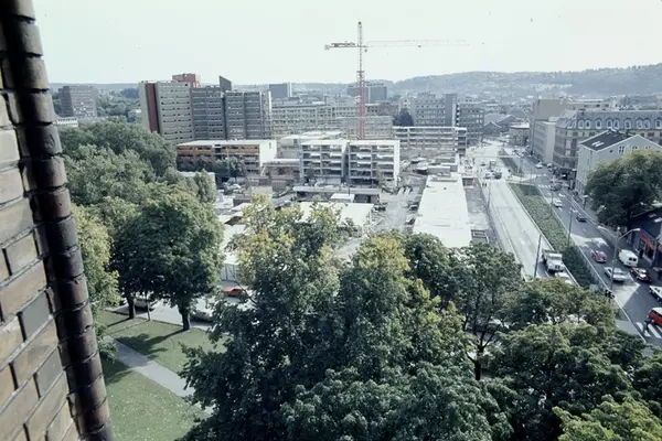 byggetomt, Yrkesskolenes hybelhus, kran, gateløp, biler, bygårder