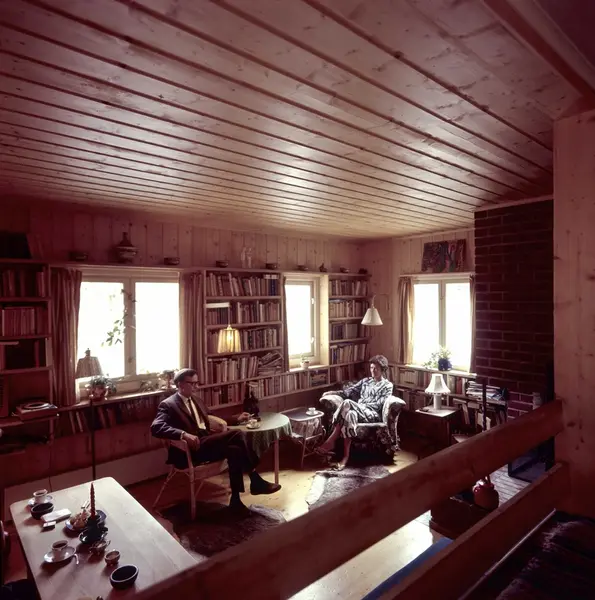 bolighus, interiør, stue, mann, skuespiller, kvinne, forfatter, bokhyller