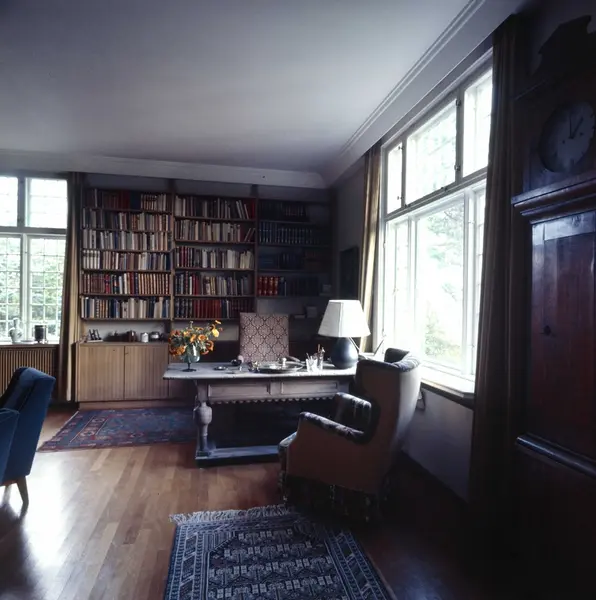 bolig, interiør, stue, bokhyller, skrivebord