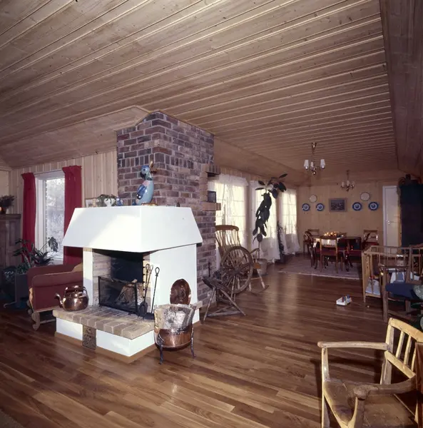 villa, interiør, stue, peis, furupanel