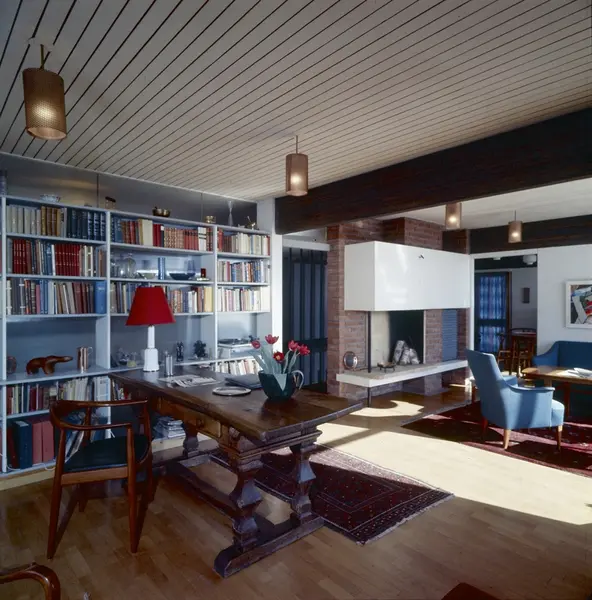 villa, interiør, stue, peis, bokhyller
