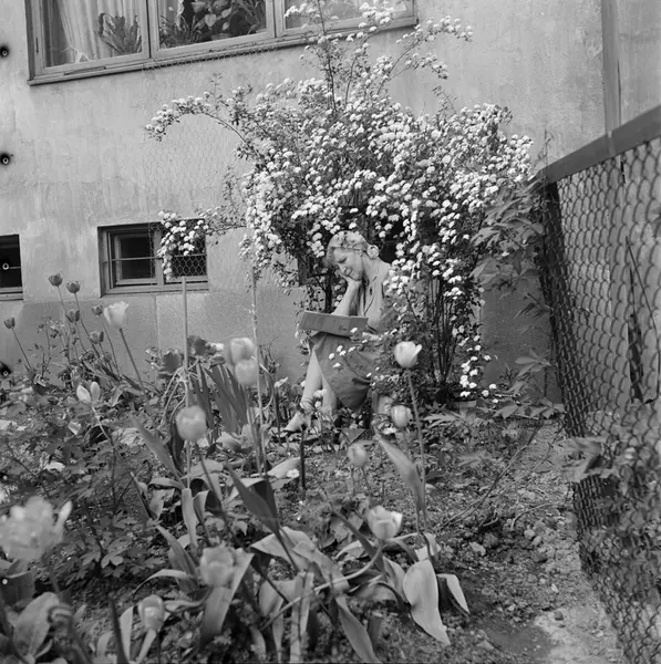 hage, kvinne, blomster, bygård