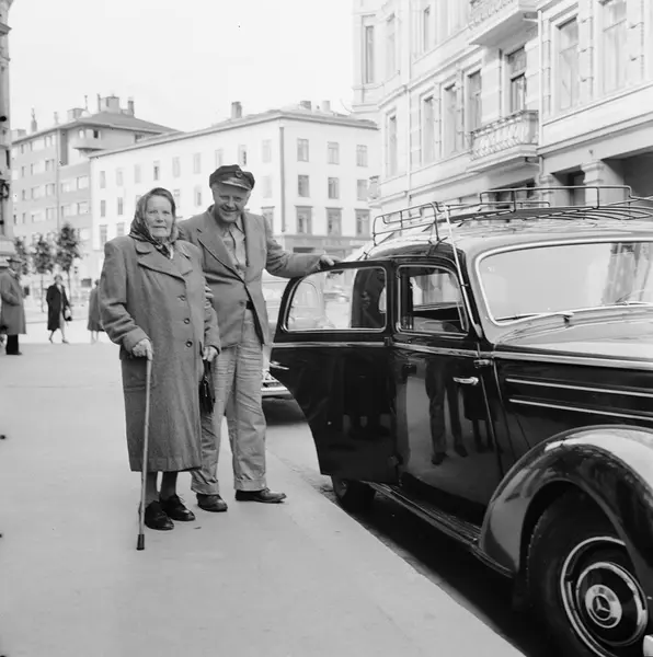 fortau, kvinne, mann, drosjesjåfør, bil, drosje, bygård