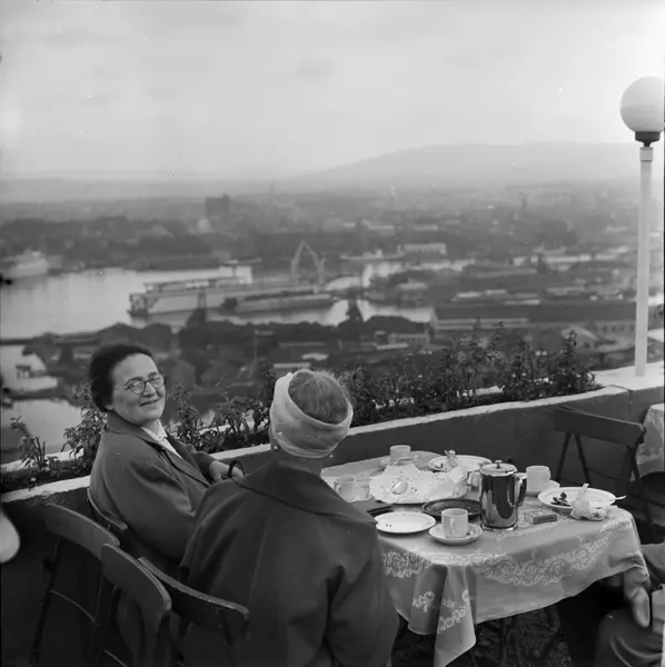 Ekebergrestauranten, friluftsrestaurant, kvinner, bord, kaggekanne, kaffekopper, utsikt, by