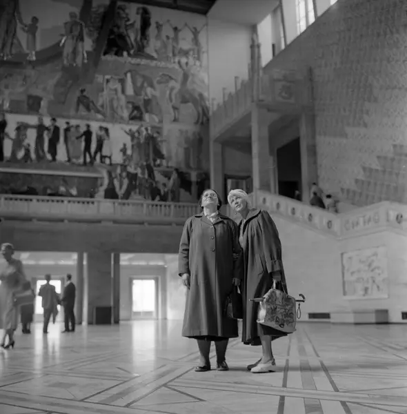 Rådhuset, interiør, sentralhallen, kvinner, trapp, veggmalerier