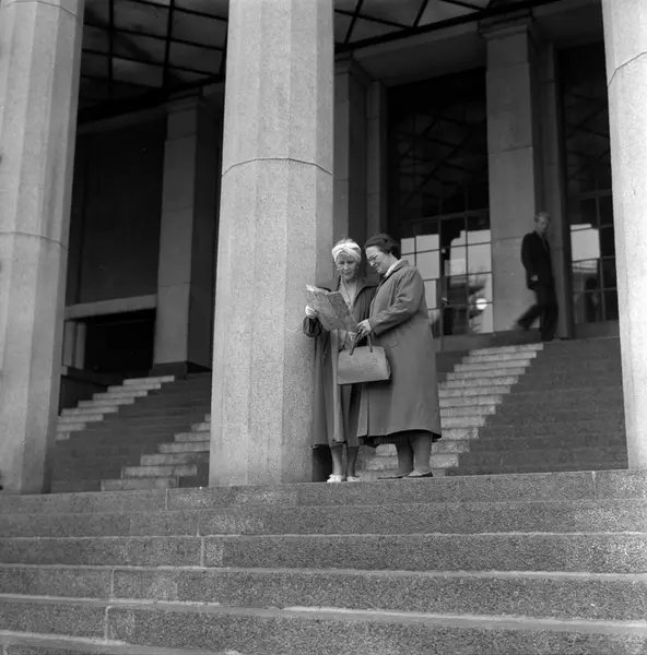 Rigmor Dahl Delphin (1908-1993) var ansatt som fotograf i ukebladet Alle Kvinner. Hennes negativarkiv ble i 2005 overført Oslo Bymuseum fra Gyldendal Norsk Forlag som var utgiver av bladet. Bildet er fra serien "Drømmedag i Oslo for Hilma Ludvigsen, Sandnessjøen." Hilma Ludvigsen til høyre.