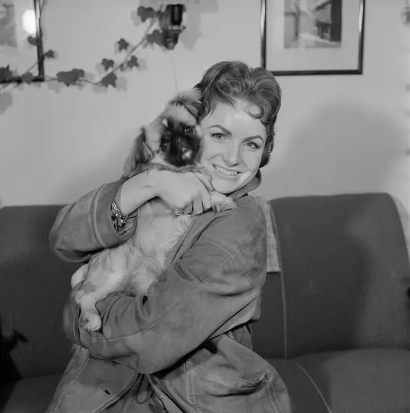 bolig, interiør, stue, kvinne, sangerinne, hund, pekingneser