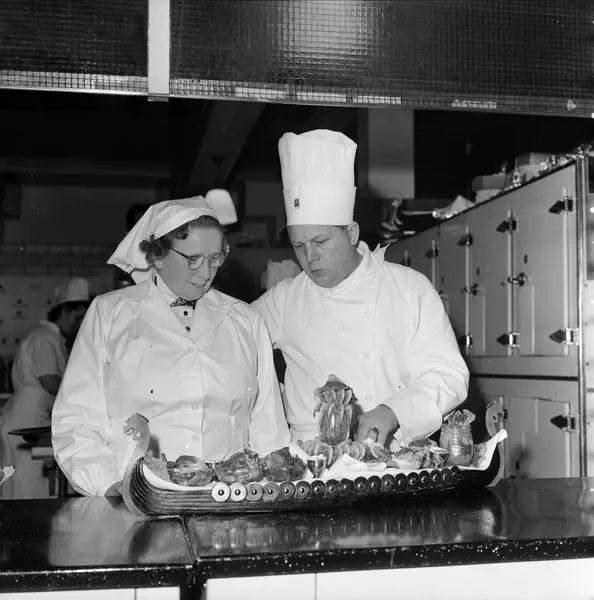 Hotell Viking, interiør, kjøkken, mann, kokk, kvinne, oppsats med sjømat, vikingskip
