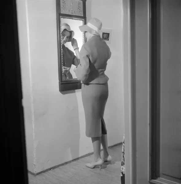 bolig, interiør, entré, kvinne, skuespiller, moteklær, drakt, hatt, speil