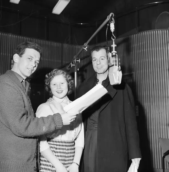 Fra innspillingen av enakteren "De knutna händerna" av Vilhelm Moberg. Alf Prøysen hadde oversatt og Jack Fjelstad var instruktør. Rigmor Dahl Delphin (1908-1993) var ansatt som fotograf i ukebladet Alle Kvinner. Hennes negativarkiv ble i 2005 overført Oslo Bymuseum fra Gyldendal Norsk Forlag som var utgiver av bladet.
