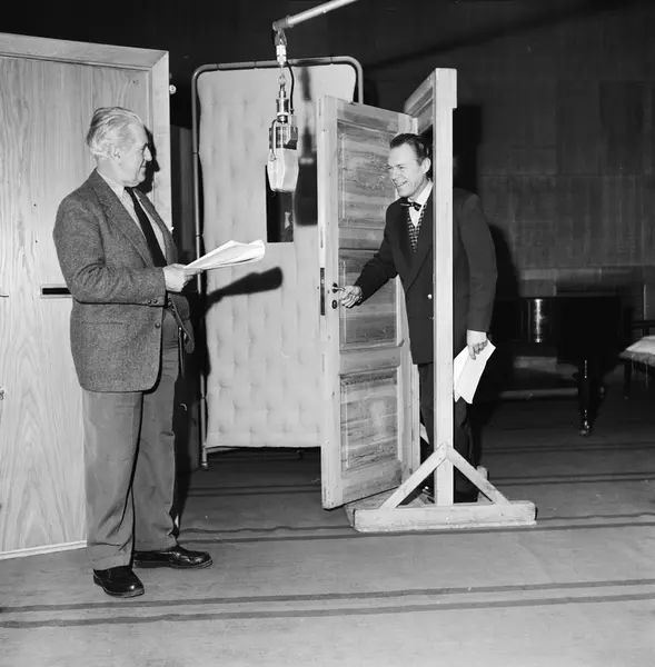 Fra innspillingen av enakteren "De knutna händerna" av Vilhelm Moberg. Alf Prøysen hadde oversatt og Jack Fjelstad var instruktør. Rigmor Dahl Delphin (1908-1993) var ansatt som fotograf i ukebladet Alle Kvinner. Hennes negativarkiv ble i 2005 overført Oslo Bymuseum fra Gyldendal Norsk Forlag som var utgiver av bladet.