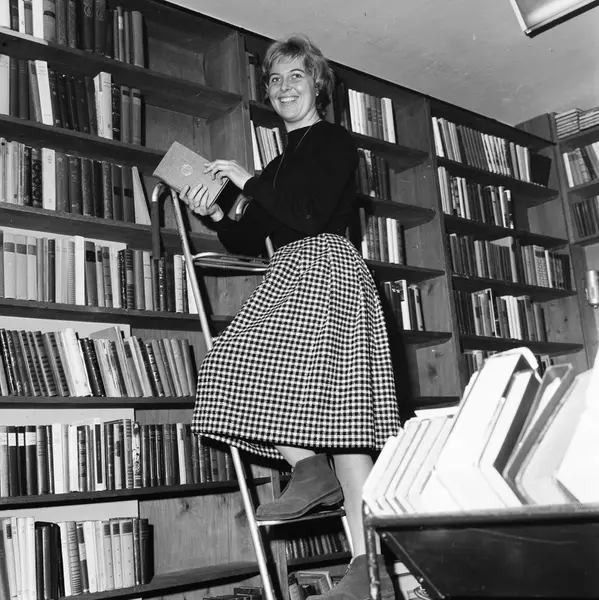bibliotek, interiør, kvinne, bibliotekar