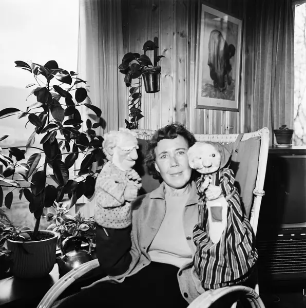 bolig, interiør, stue, kvinne, forfatterinne, fingerdukker