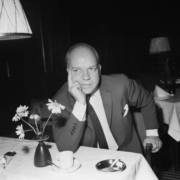 portrett, mann, skuespiller, sittende halvfigur ved restaurantbord, sigarett