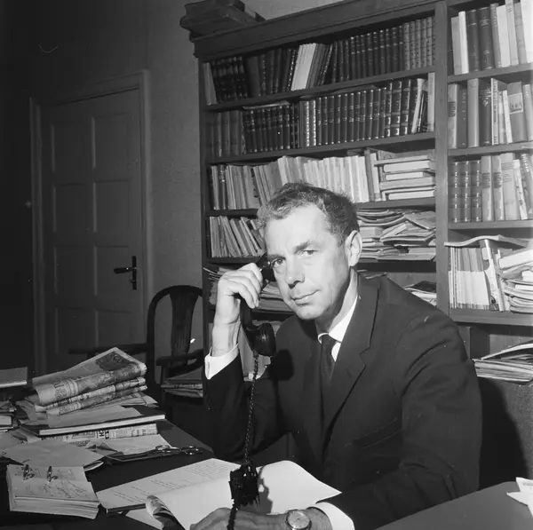 portrett, mann, sceneinstruktør, teatersjef, sittende halvfigur ved skrivebord, bokhylle