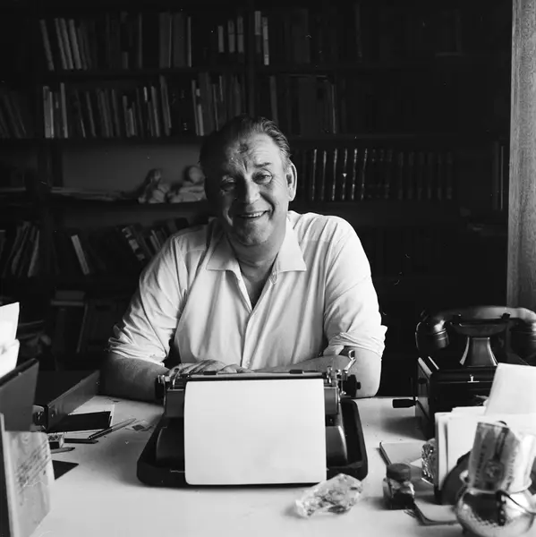 bolig, interiør, mann, forfatter, visesanger, sittende halvfigur ved skrivebord, skrivemaskin, bokhylle