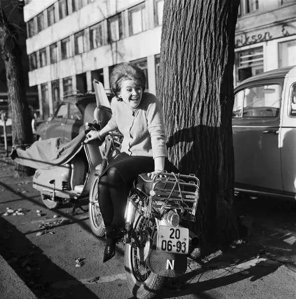 Kirsti Sparboe sitter på en lett motorsykkel av type Tempo Sport 125cc. Rigmor Dahl Delphin (1908-1993) var ansatt som fotograf i ukebladet Alle Kvinner. Hennes negativarkiv ble i 2005 overført Oslo Bymuseum fra Gyldendal Norsk Forlag som var utgiver av bladet.