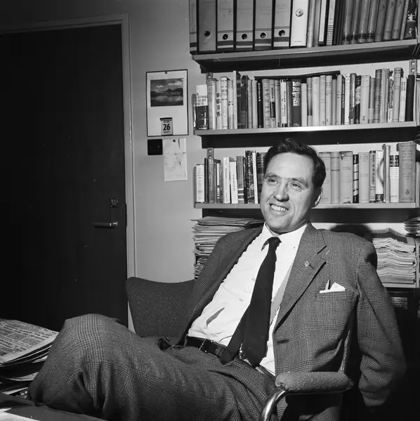Norsk rikskringkasting, interiør, kontor, mann, utenriksredaktør, sittende halvfigur ved skrivebord