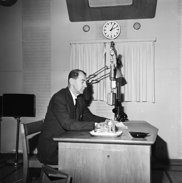 Norsk rikskringkasting, interiør, studio, mann, programredaktør, sittende halvfigur ved bord, mikrofon