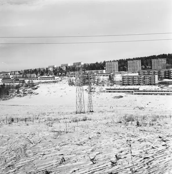 kulturlandskap, blokkbebyggelse, rekkehus, kraftledninger, mennesker, snø