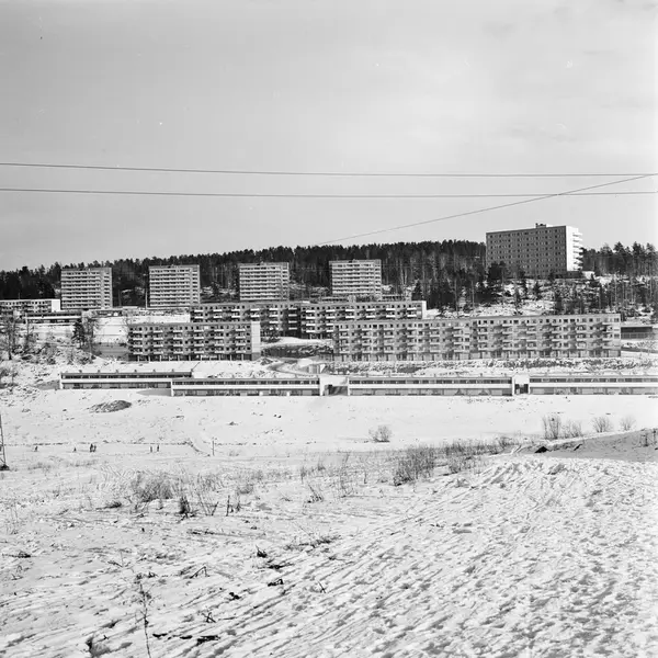 Høyblokken (trygdebolig) til høyre i bildet er Rustadgrenda 1. De fire høyblokkene i bakgrunnen ligger i Stallerudveien 89-95. Bildet er tatt fra Paal Bergs vei ikke langt fra Løvsetfaret. Se også panoramaversjon satt sammen av OB.RD4238g, h og f, med nummer OB.RD4238ghf. Rigmor Dahl Delphin (1908-1993) var ansatt som fotograf i ukebladet Alle Kvinner. Hennes negativarkiv ble i 2005 overført Oslo Bymuseum fra Gyldendal Norsk Forlag som var utgiver av bladet.