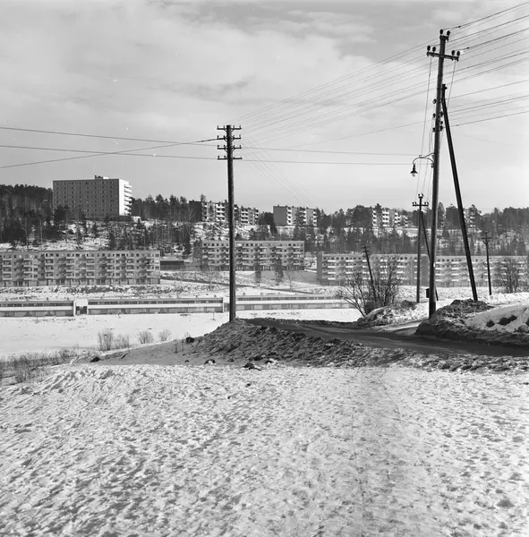 Høyblokken (trygdebolig) til venstre i bildet er Rustadgrenda 1. Se også panoramaversjon satt sammen av OB.RD4238g, h og f, med nummer OB.RD4238ghf. Rigmor Dahl Delphin (1908-1993) var ansatt som fotograf i ukebladet Alle Kvinner. Hennes negativarkiv ble i 2005 overført Oslo Bymuseum fra Gyldendal Norsk Forlag som var utgiver av bladet.