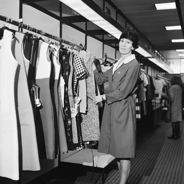 Steen & Strøm, interiør, kjoleavdeling, kvinne, ekspeditrise, stativ, kjoler