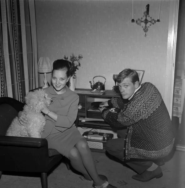 bolig, interiør, stue, kvinne, sangerinne, sittende i sofa, mann, hund, puddel, platespiller
