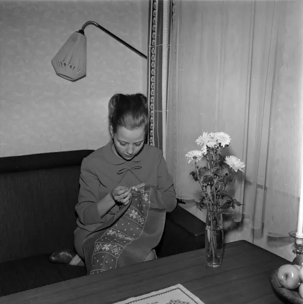 bolig, interiør, stue, kvinne, sangerinne, sittende i sofa, håndarbeid, broderi