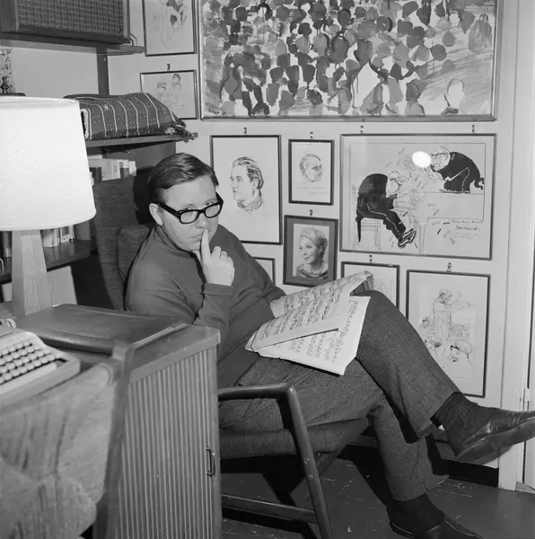 bolig, interiør, stue, mann, pianist, sittende i lenestol, notehefte