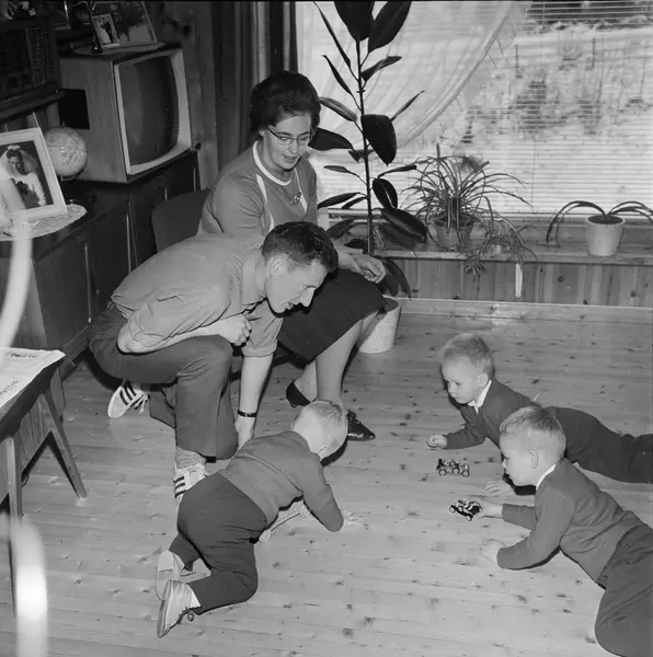 bolig, interiør, stue, kvinne, mann, skiløper, gutter3, lek
