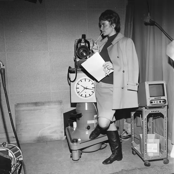 Norsk Rikskringkasting, interiør, fjernsynsstudio, kvinne, TV-vertinne