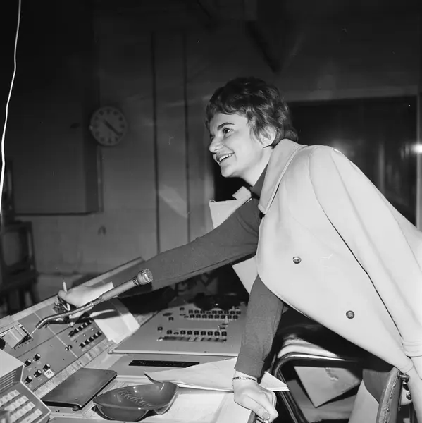 Norsk Rikskringkasting, interiør, fjernsynsstudio, kvinne, TV-vertinne