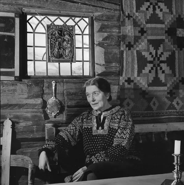 Bjørnsgard, tømmerhus, interiør, stue, kvinne, skuespiller, bondeantikviteter