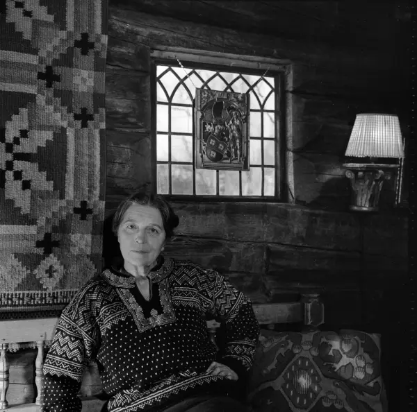 Bjørnsgard, tømmerhus, interiør, stue, kvinne, skuespiller, bondeantikviteter