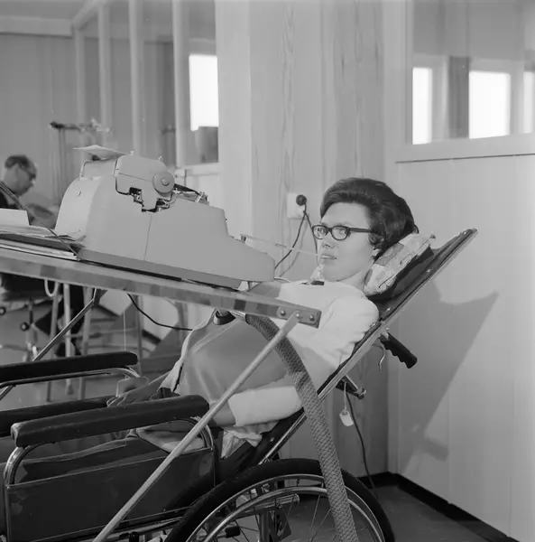 Sunnaas sykehus, interiør, kvinne, poliopasient, rullestol, skrivemaskin
