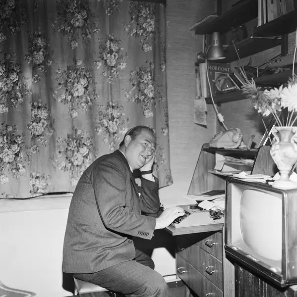 bolig, interiør, mann, skuespiller, sittende ved skrivebord, skrivemaskin, bokhylle, fjernsyn