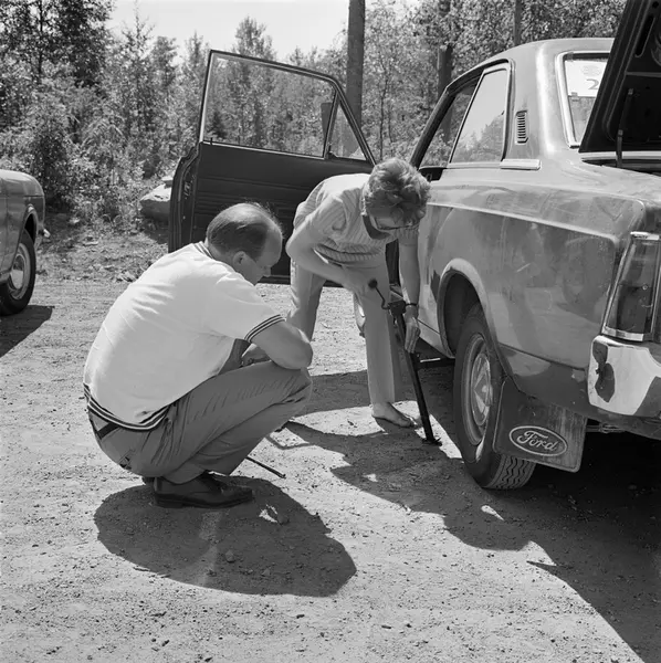 Damenes Trafikkløp, bil, mann, kvinne med jekk, hjulskift