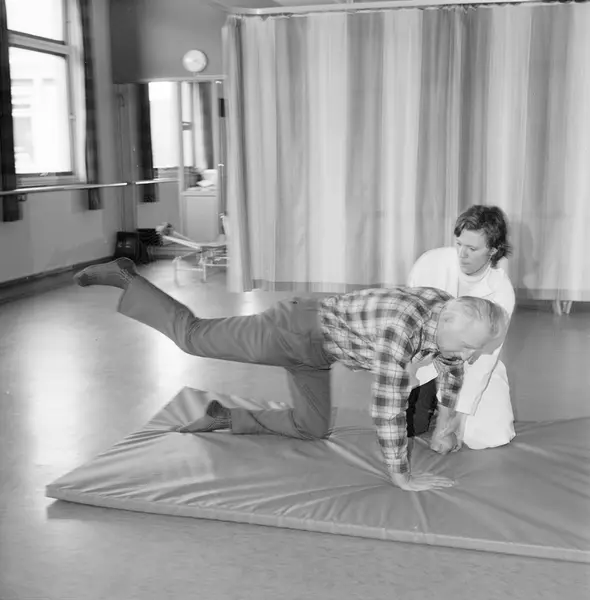Ullevål sykehus, Fysikalsk-medisinsk avdeling, mann, pasient, kvinne, fysioterapeut, gymnastikk