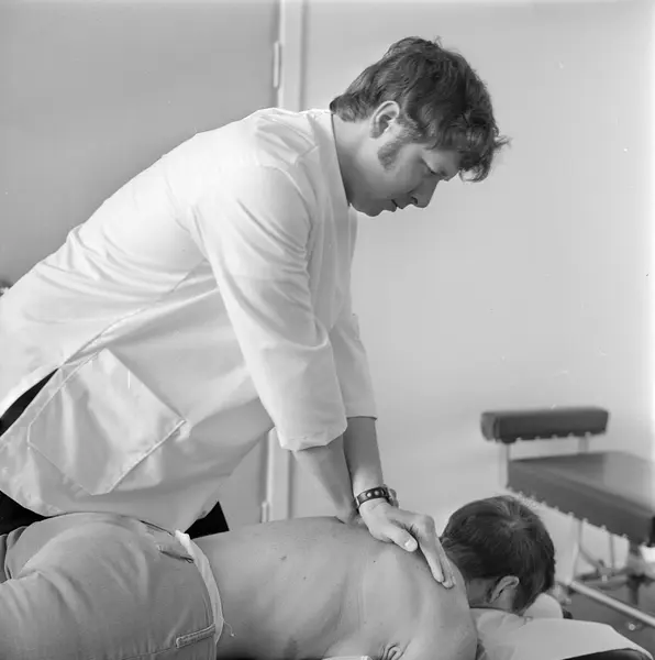 kiropraktorkontor, interiør, menn, kiropraktor, pasient, benk, behandling