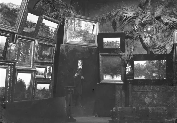 Kunst-Udstilling i Kristiania 1882 (Den første Høstutstillingen) i Det Norske Studentersamfund, 1882, interiør, utstillingslokale, kunstutstilling, malerier